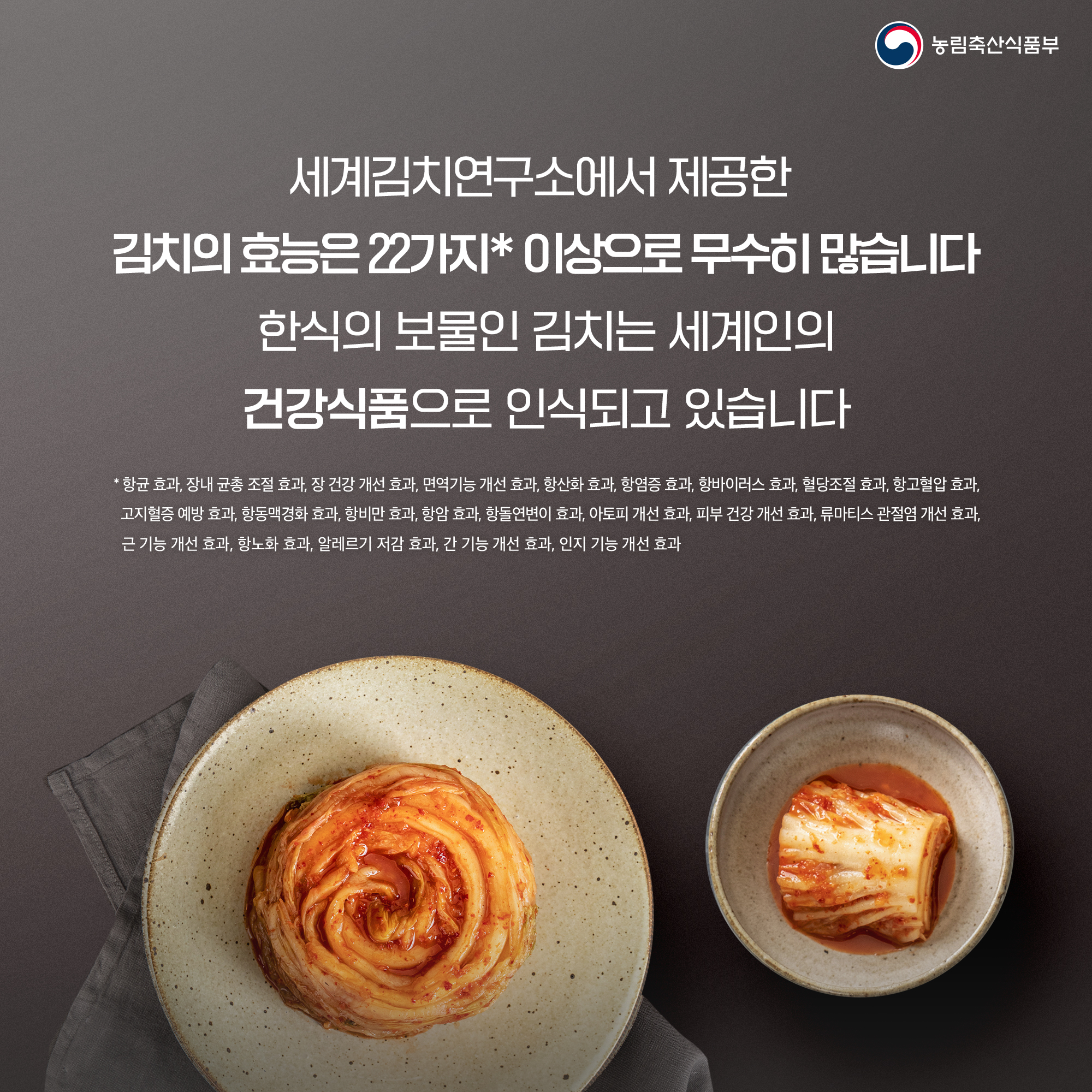 김치는 단순한 반찬이 아닌, 건강에 매우 유익한 음식입니다. 세계김치연구소에서 제공한 정보에 따르면, 김치의 효능은 22가지 이상으로 다양합니다. 이 중 몇 가지를 소개하자면, 항균 효과, 장내 균총 조절, 면역기능 개선, 항산화, 항염증, 혈당 조절, 항고혈압, 고지혈증 예방, 항암 효과, 피부 건강 개선 등이 있습니다.