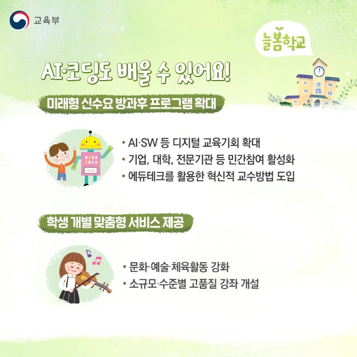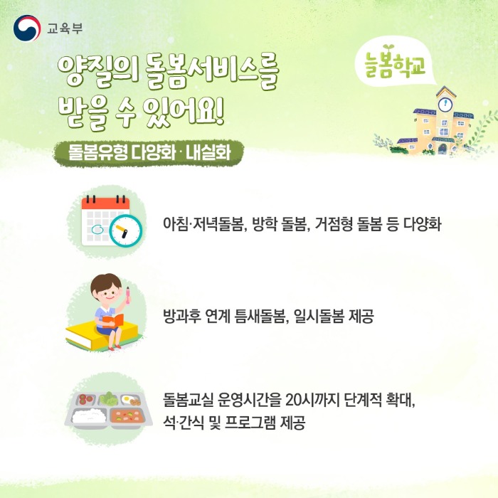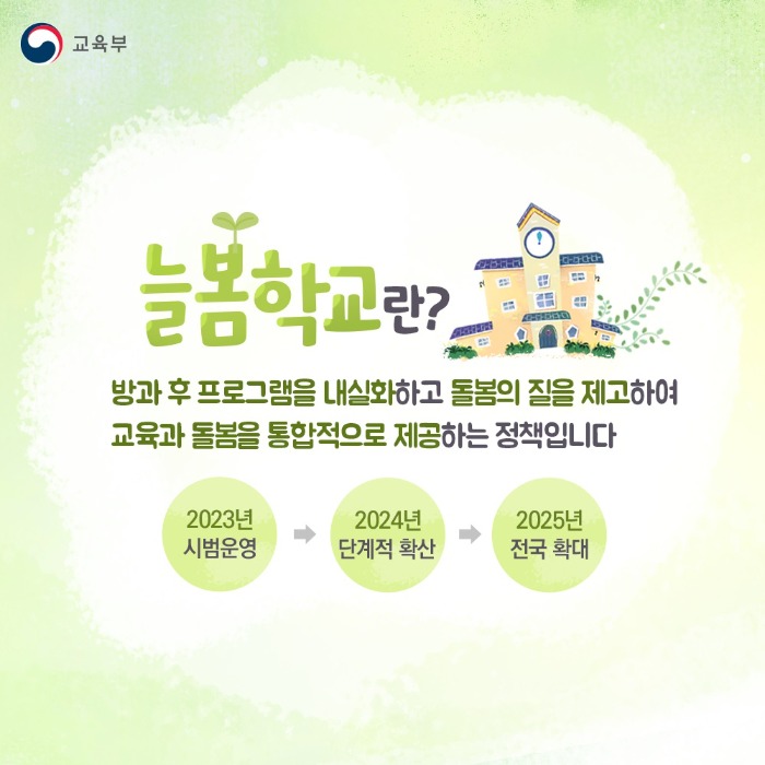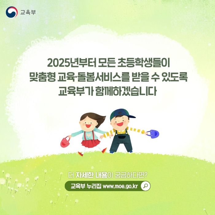 초등 수업이 끝난 후 방과 후 프로그램과 돌봄의 질을 제고하여, 교육과 동시에 돌봄을 통합적으로 제공하는 교육부 정부 정책입니다.
