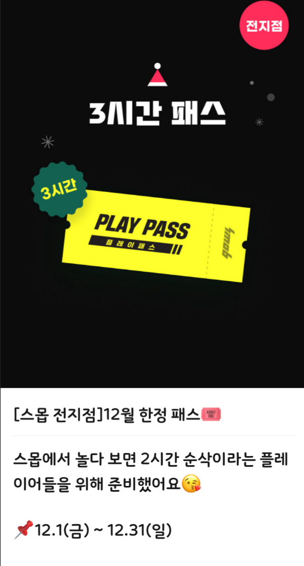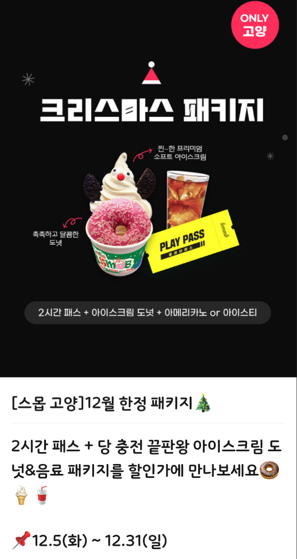스몹(SMOB) by 스포츠몬스터는 가족, 친구, 연인과 함께 즐길 수 있는 최적의 장소입니다. 이번 12월 한정 패키지 이벤트를 통해 즐거운 시간을 보내시길 바랍니다.