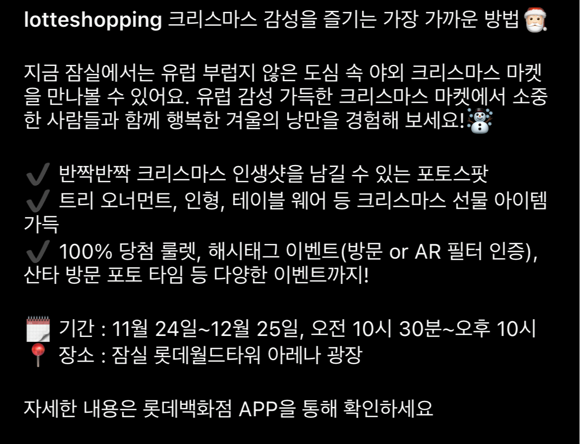 잠실 크리스마켓은 가족, 친구, 연인과 함께 겨울의 정취를 만끽할 수 있는 완벽한 장소입니다. 이번 겨울, 잠실 크리스마켓에서 특별한 추억을 만들어 보세요. 저희는 여러분이 이 멋진 행사를 즐기시길 바랍니다!