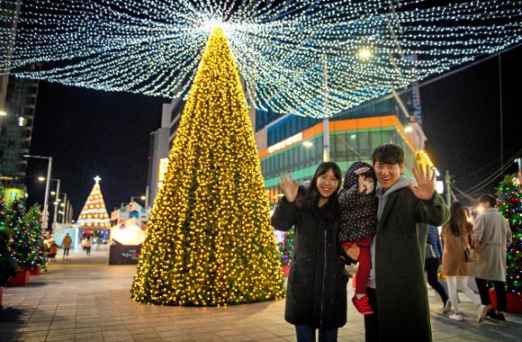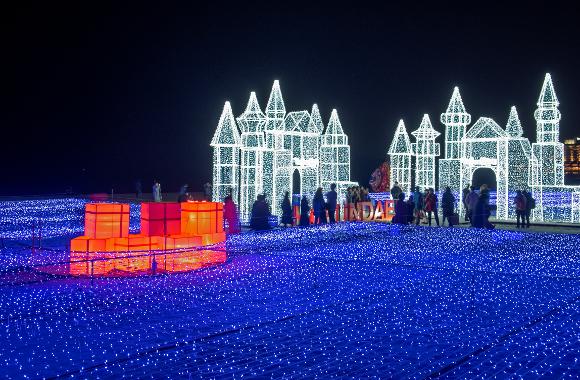 광장의 끝에 자리한 거대한 크리스마스트리는 그 자체로 하나의 볼거리입니다. 초록색 트리 아래 서면 마치 행복이 가득 차오르는 듯한 느낌을 받을 수 있습니다. 또한, 푸른 빛깔의 파도가 춤추는 모래사장에는 은색으로 빛나는 빛의 성이 아름다운 경관을 이룹니다.